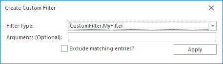Initialize - A custom filter is initialized with a string that is provided by the user when creating the filter. Providing an initialization string to a custom filter is optional as some filters may not need initialization. Initialization arguments can use Argument Templates.