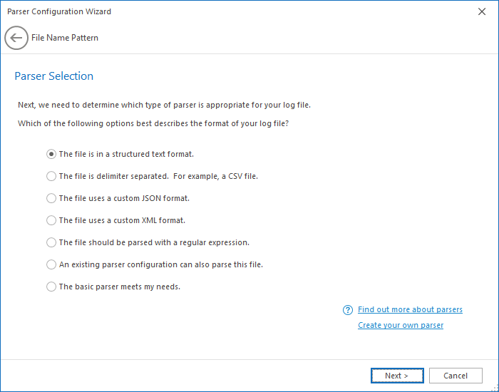 The next step in the Parser Configuration Wizard, is to determine which parser best matches your log file data. All that you need to do here is answer the given question to the best of your ability. The Parser Wizard currently supports seven different parser types and each of the options provided correspondence to one of the seven types: Pattern Parser, DSV Parser, Apache XML (a zero configuration variant of the XML parser), Xml Parser, JSON Parser, Regular Expression and the Basic Parser.