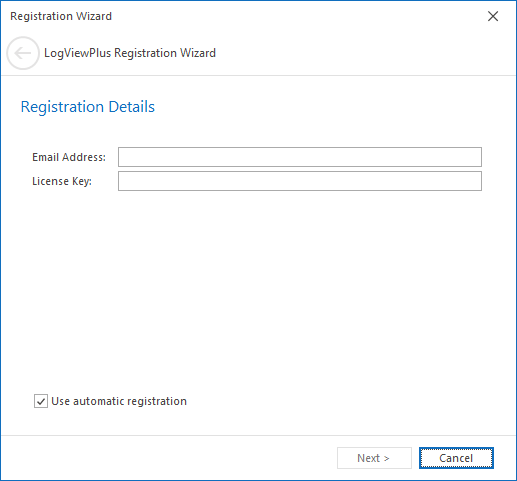 The first step in the registration process is to enter the e-mail address and license key you received after your payment was processed. This information is sent to you from LogViewPlus support. If you experience a delay in receiving your license key, it may be worth checking your junk email folder before contacting LogViewPlus support.