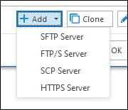 The add server drop-down is used to determine the type of server that you want to configure. Based on the server type selected you will be presented with either the SFTP, FTP, SCP or HTTPS configuration screen.